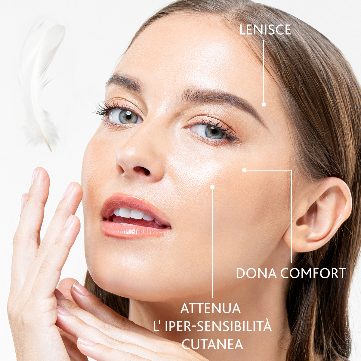Lenisce istantaneamente la pelle e ne aumenta la soglia di tollerabilità. La pelle ritrova comfort e benessere. Appare riposata e lenita. Irritazioni, rossori e sensazioni di fastidio sono attenuate.