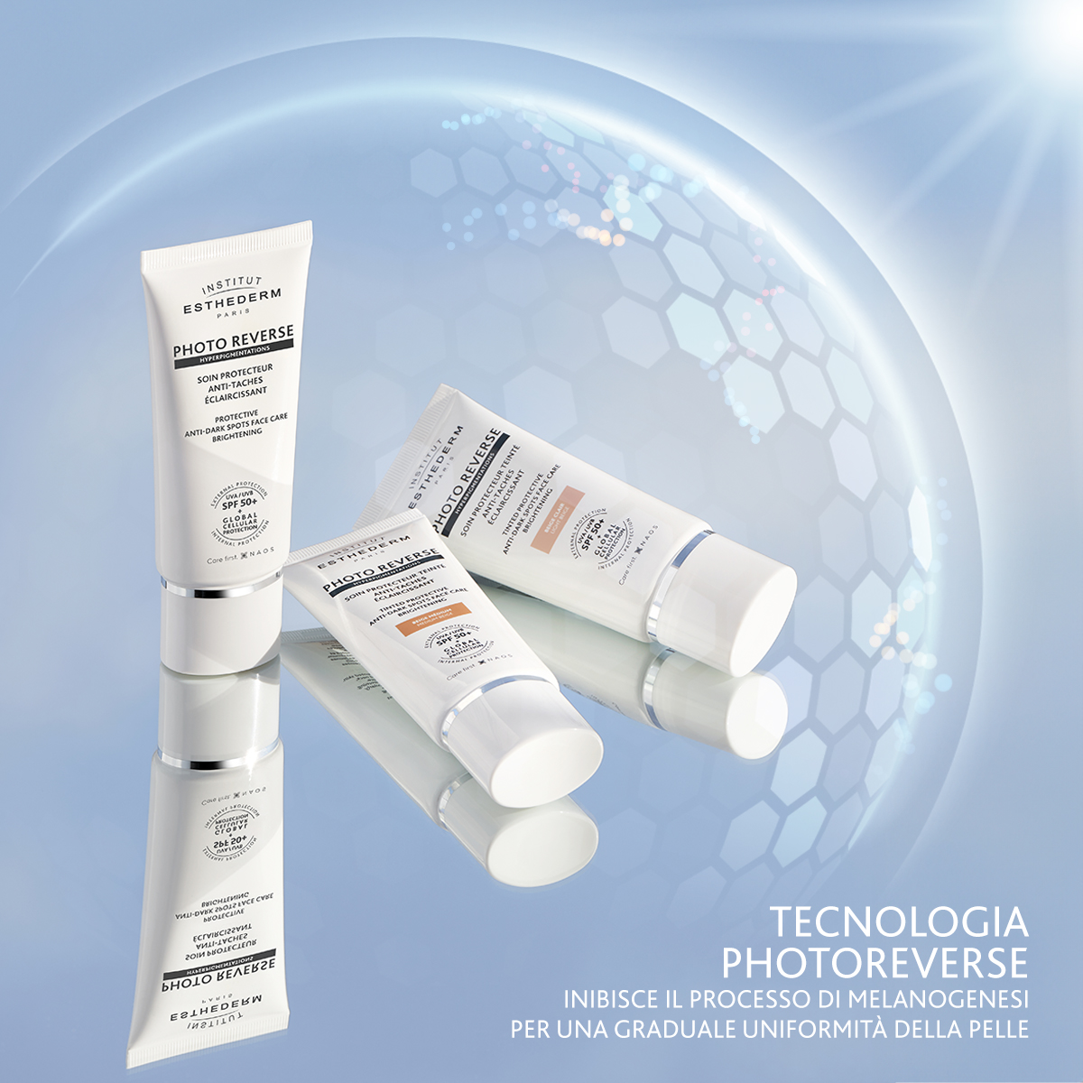 La linea PHOTO REVERSEdi Institut Esthederm è progettata per offrire una protezione avanzata contro i danni solari e le alterazioni della pelle causate dall'esposizione ai raggi UV. Questi prodotti sono ideati per contrastare gli effetti dell'ipigmentazione e prevenire le macchie scure, garantendo una pelle dall'aspetto uniforme e luminoso.