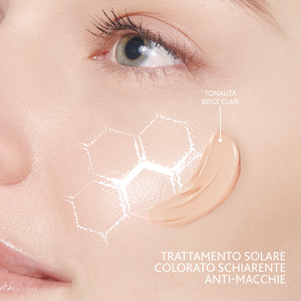 La pelle è protetta dalla comparsa di nuove macchie e dal fotoinvecchiamento. Le macchie esistenti si schiariscono. L'incarnato si uniforma ed è visibilmente più luminoso.